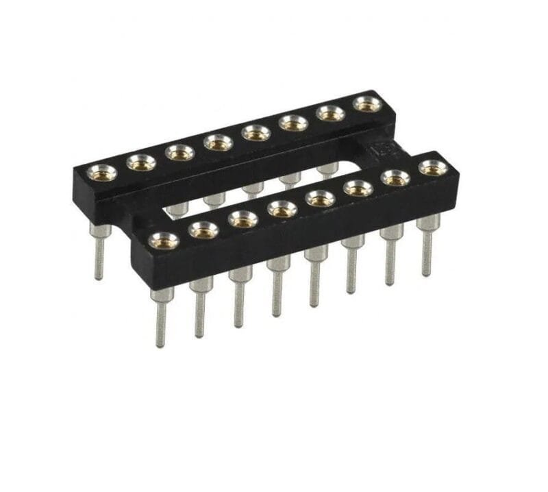 This 16-pin machined IC base socket is designed for secure and reliable mounting of DIP integrated circuits on printed circuit boards. Featuring precision round machined (turned-pin) contacts and standard 2.54mm pitch, it provides excellent electrical connectivity while allowing easy IC insertion and removal without soldering directly to the IC.
