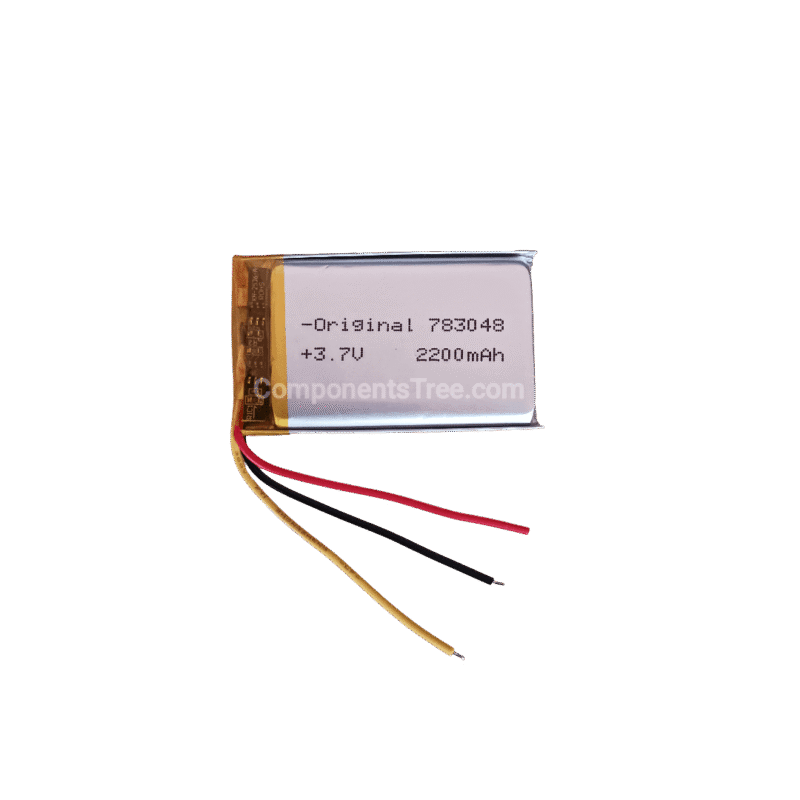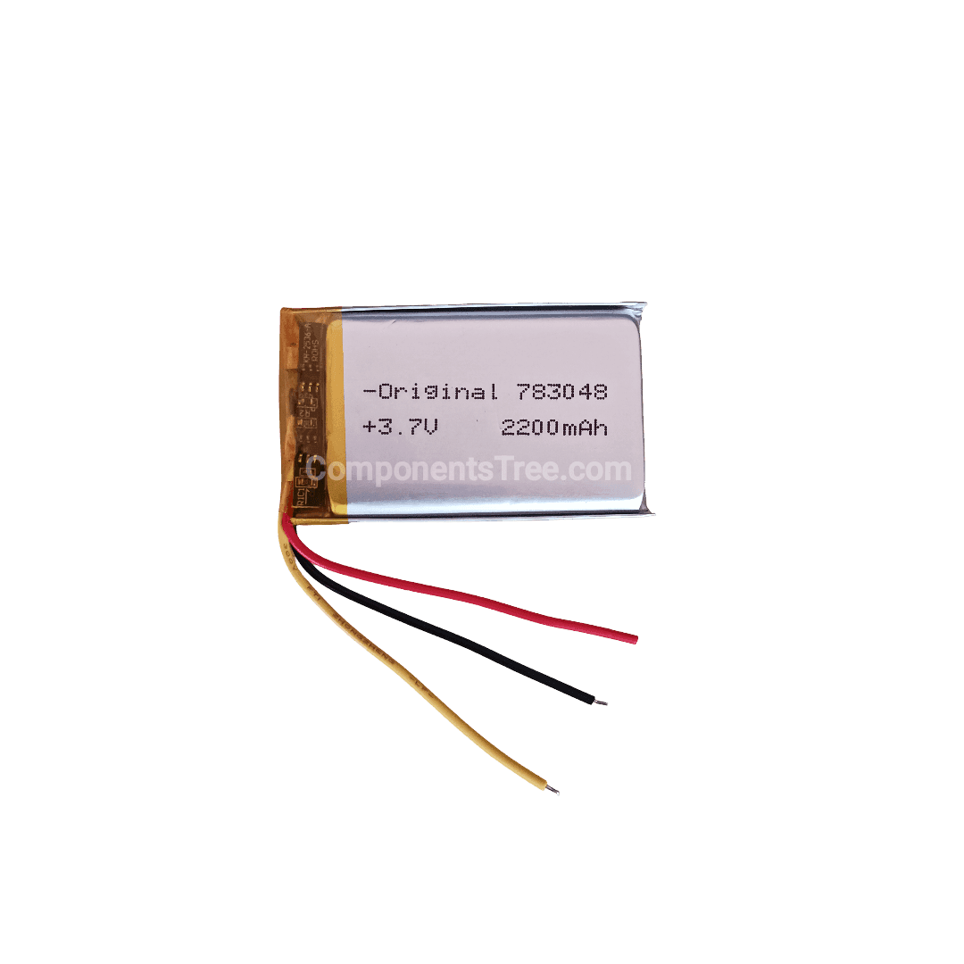 The 783048 3.7V 2200mAh Lithium Polymer Battery is a high-capacity, rechargeable Li-Po cell designed for portable electronics and devices that require stable and reliable power. This model comes with a 3-wire connection (positive, negative, and balance/thermistor wire), making it ideal for devices with built-in battery management systems or for precise voltage monitoring and charging.