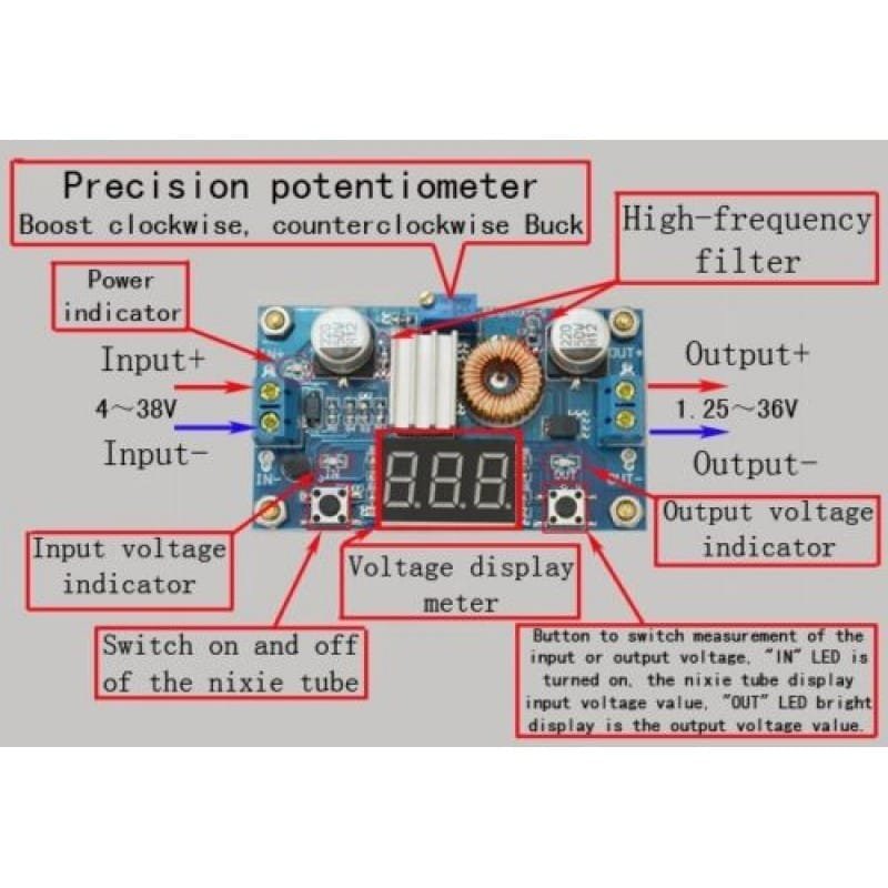 - Output Voltage Range: 1.25V – 35V DC (adjustable)